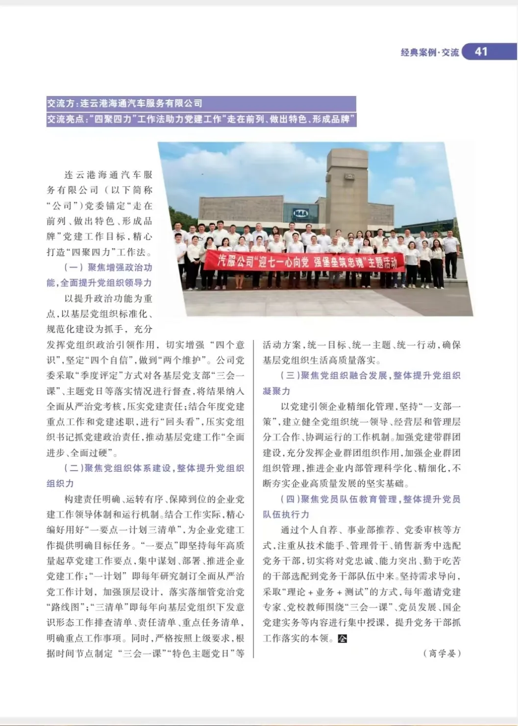 近日,《企業(yè)黨建》雜志2025年第6期“經(jīng)典案例·交流”專欄刊發(fā)文章《連云港海通汽車服務(wù)有限公司“四聚四力”工作法助力黨建工作“走在前列、做出特色、形成品牌”》。這是汽服公司在全國(guó)國(guó)有企業(yè)黨建領(lǐng)域方面的一次發(fā)聲與展示,現(xiàn)將全文轉(zhuǎn)載如下: