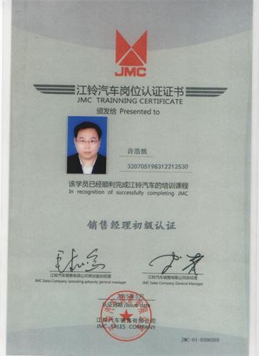 知識。培訓最后,江鈴公司對所有參訓人員進行筆試,修理公司許浩然順利通過認證培訓并拿到了江鈴銷售經(jīng)理初級認證證書。